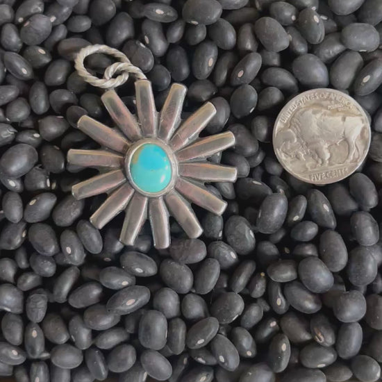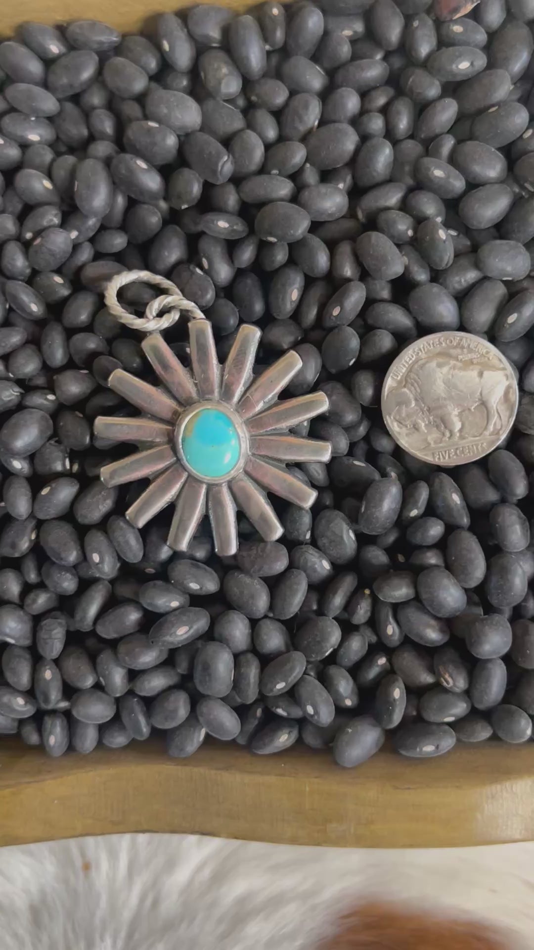 The cool tones of the turquoise and the architectural silver rays make this a versatile piece. Pair it with a simple silver snake chain for a modern look, or a Navajo pearl necklace for a traditional Southwestern ensemble.